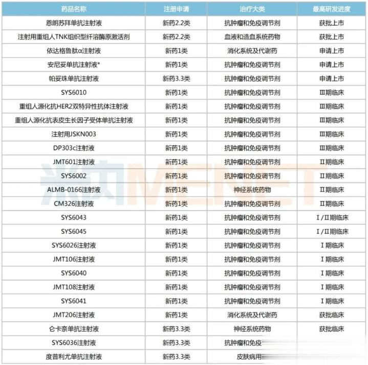 22款获批临床的新药包含17款1类新药、2款2.2类新药和3款3.3类新药。其中,SYS6010(非小细胞肺癌)、重组人源化抗HER2双特异性抗体注射液(乳腺癌)、重组人源化抗表皮生长因子受体单抗注射液(结直肠癌、非小细胞肺癌)、注射用JSKN003(乳腺癌、卵巢癌)、DP303c注射液(乳腺癌)等已进入Ⅲ期临床,申报NDA可期。
