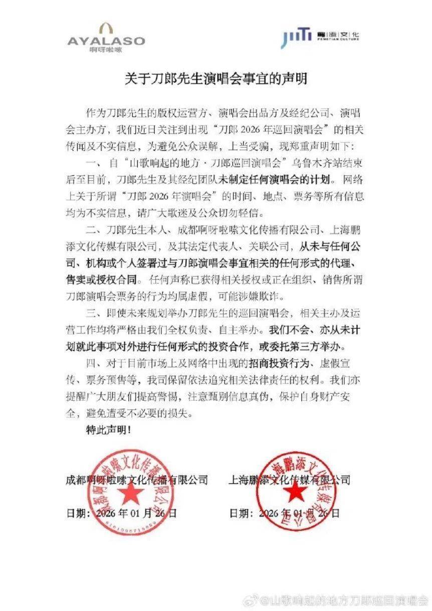 1月26日,作为刀郎的版权运营方、演唱会出品方及经纪公司、演唱会主办方,成都啊呀啦嗦文化传播有限公司、上海鹏添文化传播有限公司联合发出声明,称近日出现“刀郎2026年巡回演唱会”的相关传闻及不实信息,为避免公众误解,上当受骗,郑重声明: