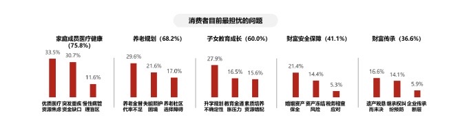 75.8%的受访家庭最担忧家庭成员的健康问题,68.2%的家庭为养老规划感到焦虑,60%的家庭担忧子女教育问题,41.1%和36.6%的家庭关注财富安全保障与传承问题。