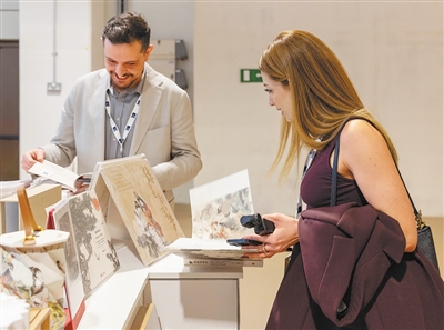 两名参展商在中国联合展台翻阅《红楼梦》画册。本报记者 许立群摄